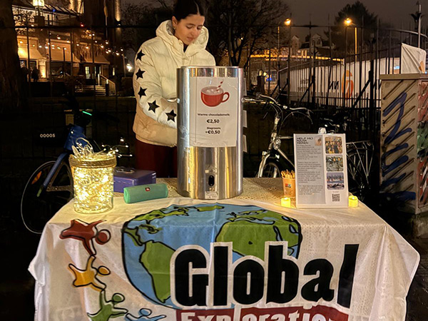 Chocolademelk verkocht tijdens de 7Heuvelenloop. Gelukkig was het koud dat weekend en gingen de bekers warme chocolademelk als warme broodjes…