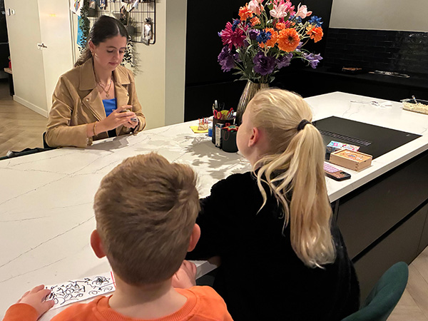 Oppassen op kinderen van vrienden van mijn ouders. Ik heb al een paar jaar ervaring in het oppassen op kinderen en ik vind het nog steeds erg leuk.